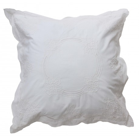 Coussin blanc 45 x 45 cm en coton de la collection Louise signé Manon de Brécourt. Revisitées,les broderies réalisées à la main, sont inspirées du style classique chic à la française en quête de simplicité champêtre pour recréer une ambiance déco harmonieuse influencée par le 18ème siècle et le linge ancien.